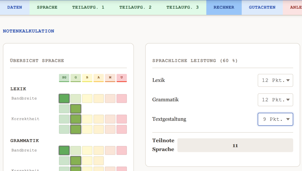 Auf dieser Website finden Sie Gutachtengeneratoren für Klausuren sund Abiturklausuren in den modernen Fremdsprachen. Die Generatoren laufen ohne Installation im Browser, Schülerleistungen können gespeichert/geladen werden und die Gutachten werden als PDFs bzw. bearbeitbare Word-Dateien exportiert.